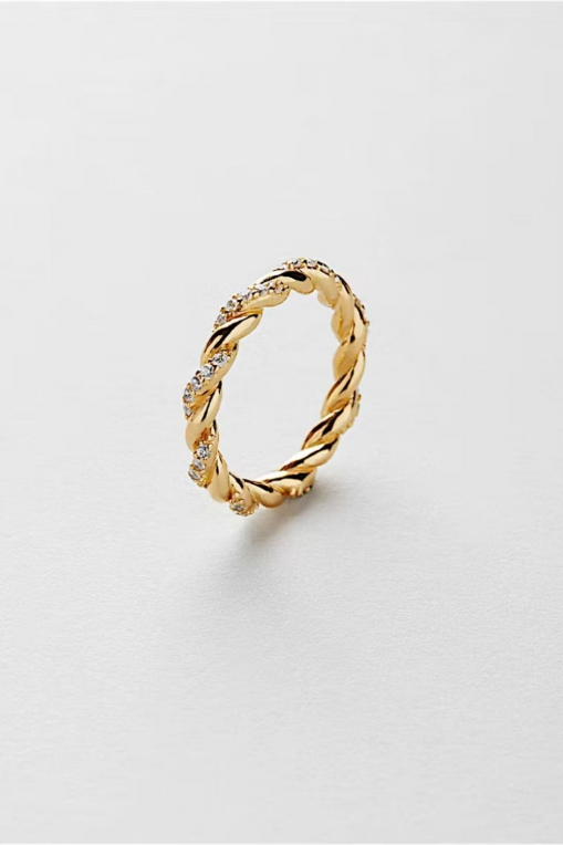 Tvunnet ring pyntet med klare Cubic Zirconia-stener, forgylt med ekte 24k gull og med en kjerne av ekte sterlingsølv 925.
