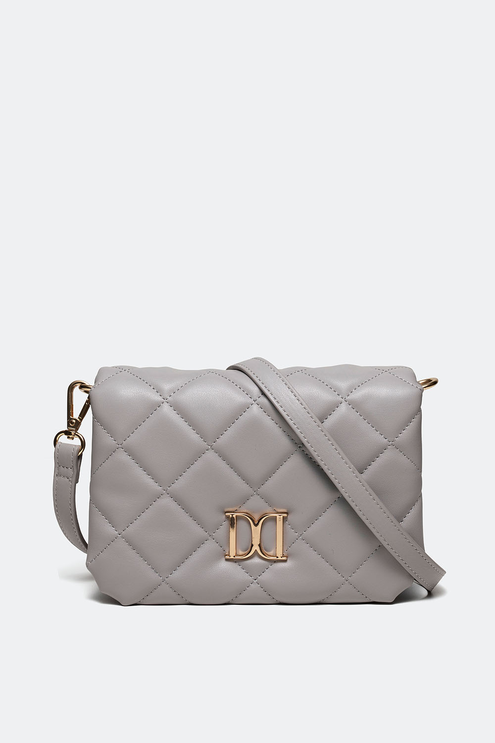 Liten grå quiltet veske med gullfarget Don Donna-spenne og skulderstropp. Vesken kommer med et stort og et lite rom og skulderremmen er justerbar og avtakbar.