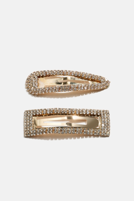 To hårspenner i gullfarget metall pyntet med hvite glassteiner. Kommer i topakning med en rektangulær og en dråpeformet spenne.