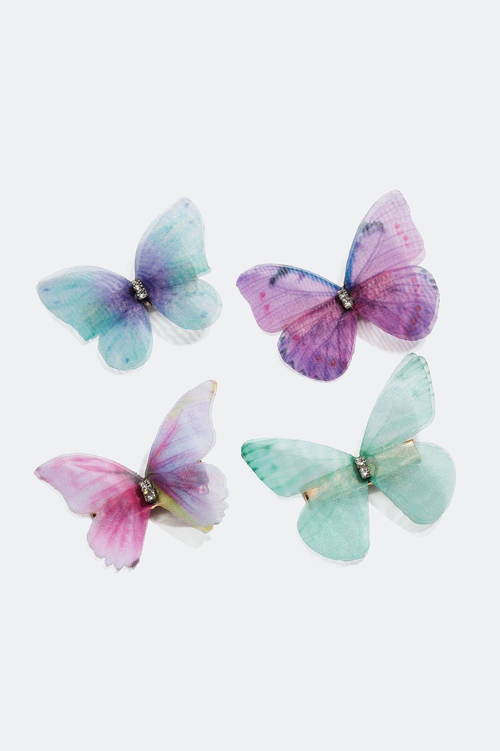 4-pakning med hårspenner i gullfarget metall med sommerfugler i en blanding av lilla og blå nyanser, pyntet med små glassteiner.
