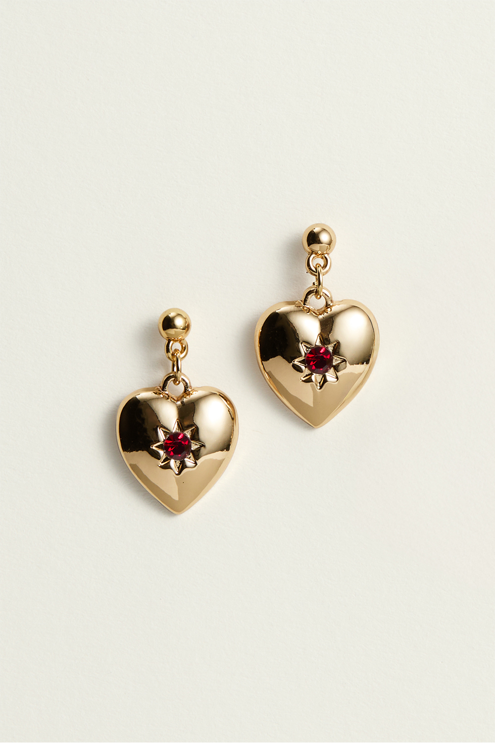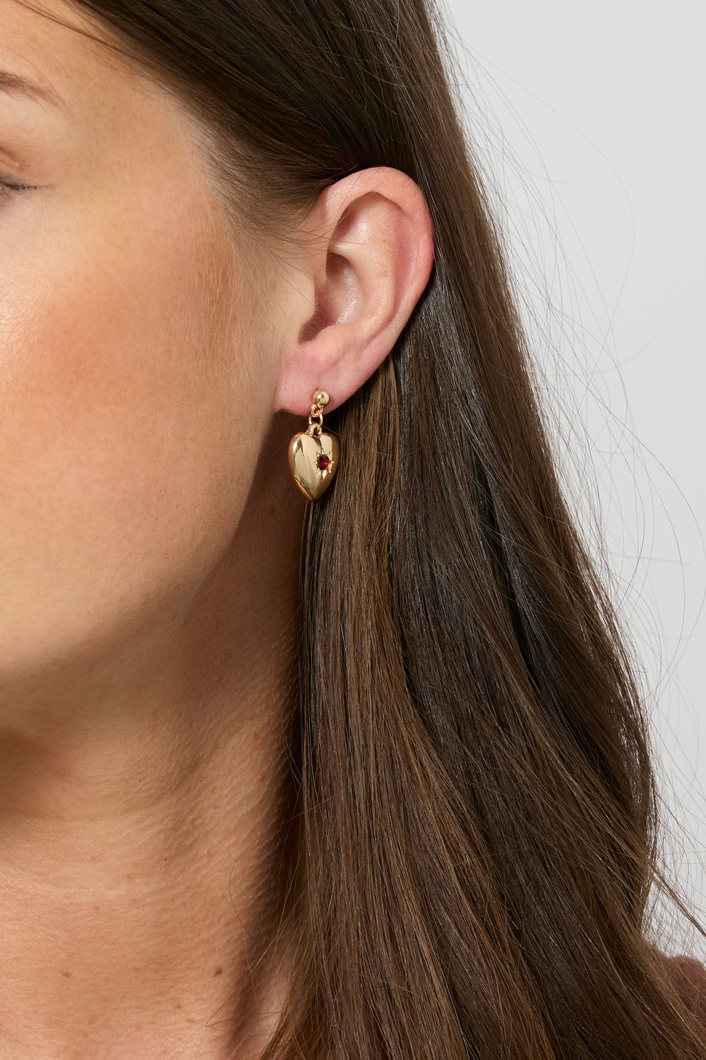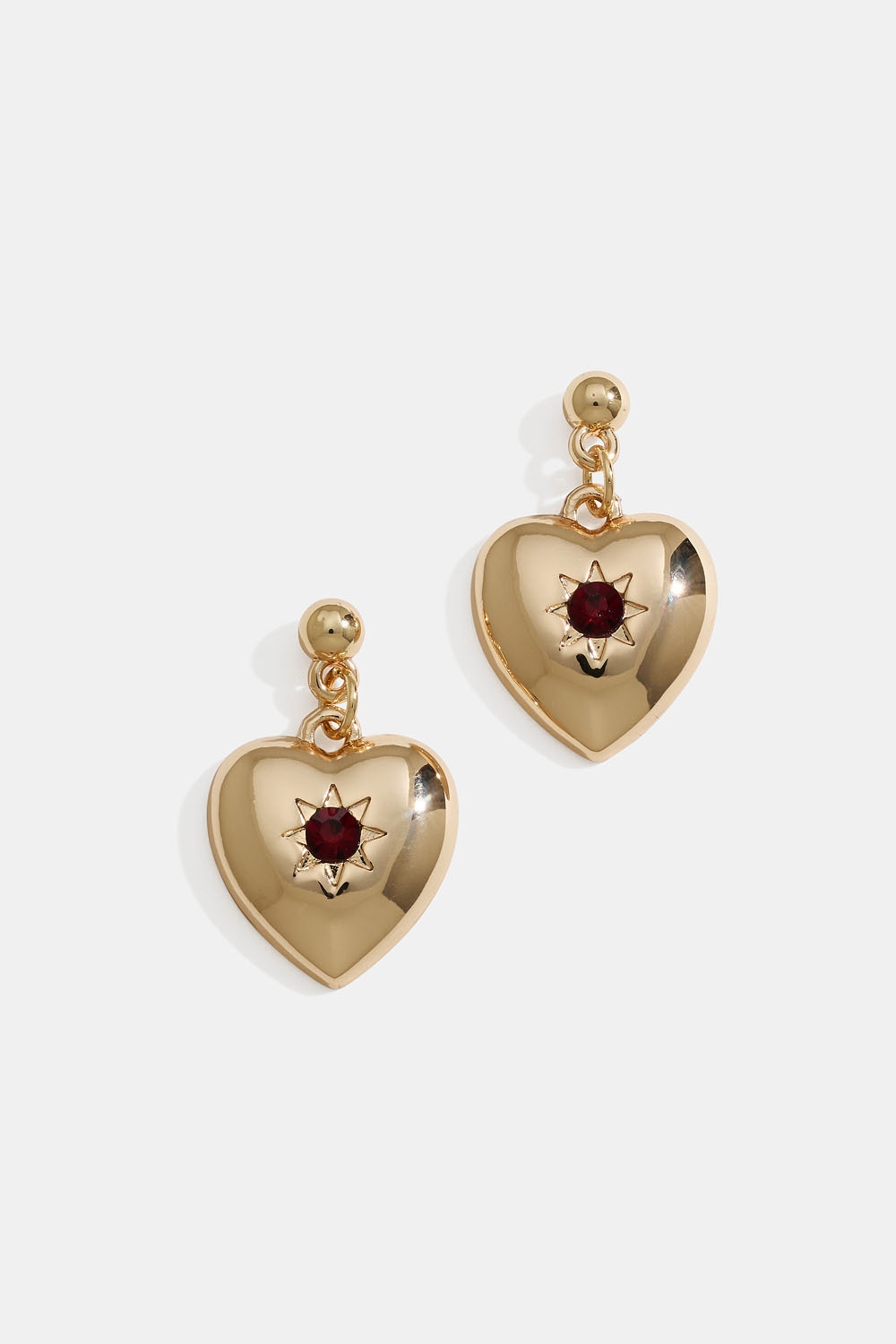 Øredobber med hengende hjerter, dekorert med en stjerne og en liten, rød sten