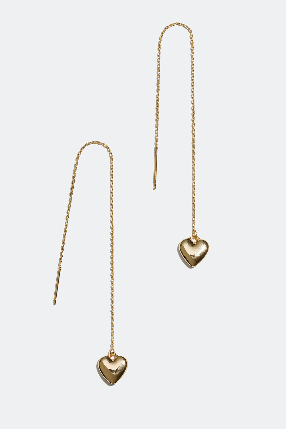 Kjedede øredobber i gullfarget metall med små hjerter nederst. Et par lange dra-igjennom-øredobber som passer til alle anledninger. Øredobben tres gjennom hullet i øret slik at lenken henger foran og bak på øreflippen. Dekorative øredobber som du enkelt bestemmer lengden på.