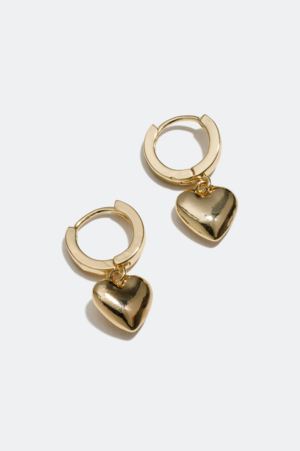 Mmni-bøyler med dekorativt hjerteanheng i blankt, gullfarget metall. Et par stilrene øredobber i romantisk design, som passer til alle anledninger og antrekk. Åpnes og lukkes enkelt med en stift som klikkes på plass.