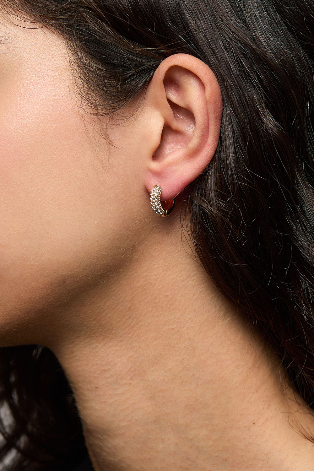 Brede minihoops i gullfarget metall med 3 rader hvit strass foran.
