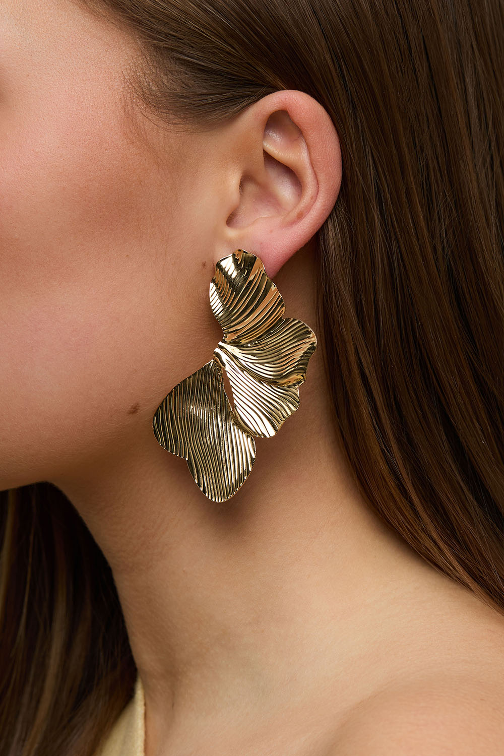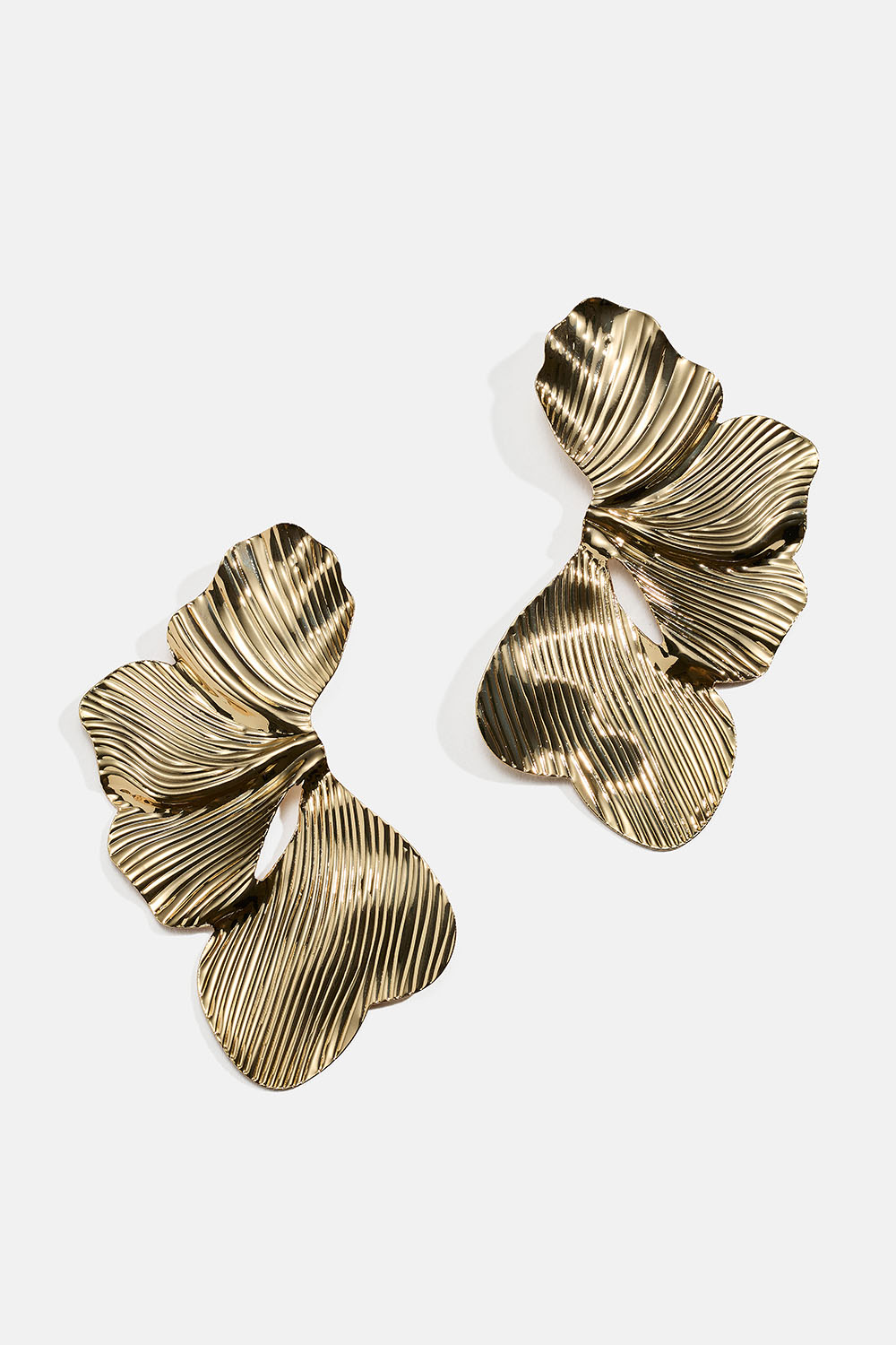 Store øredobber i gullfarget metall formet som blomsterblader i riflet design.