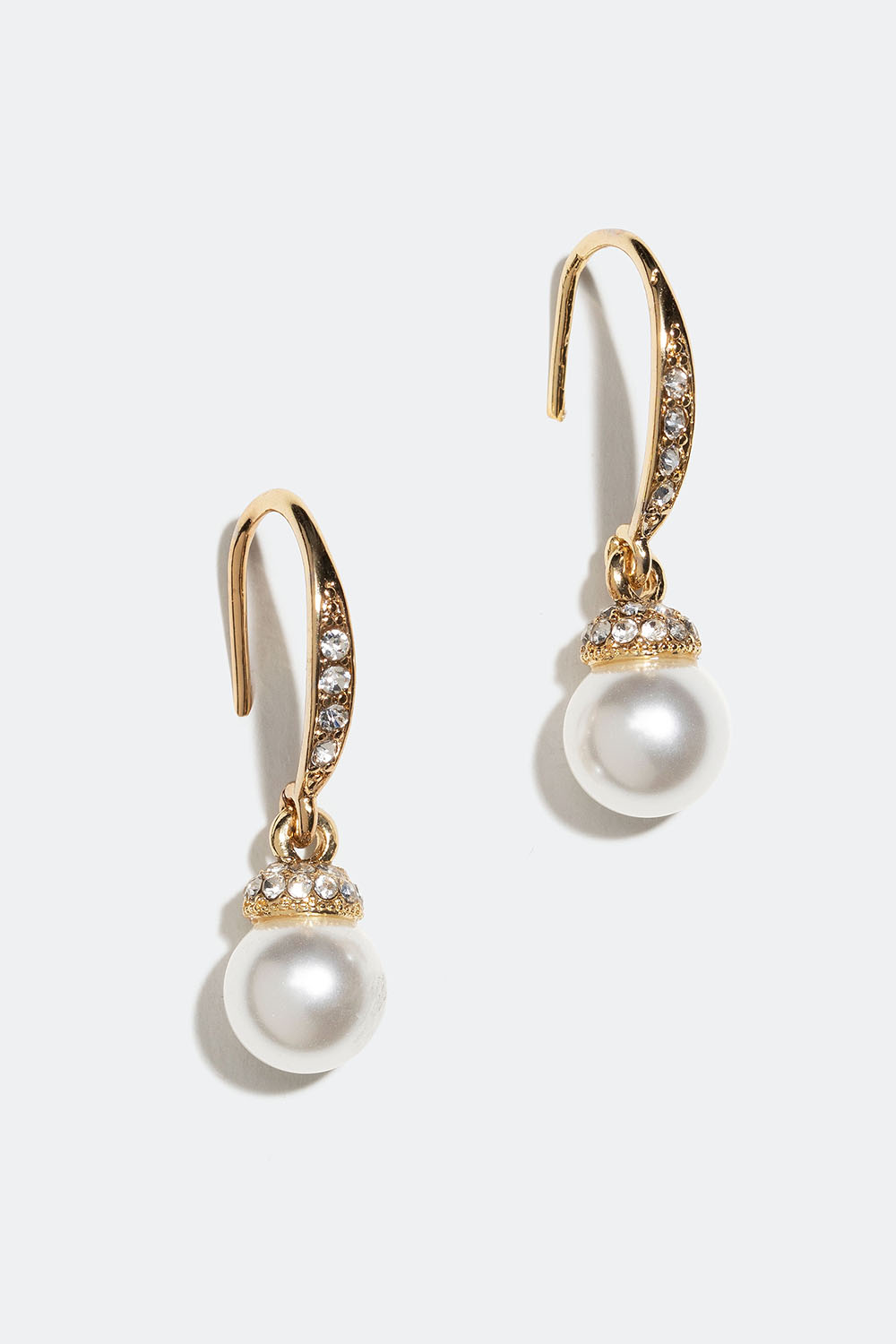 Øredobber i gullfarget metall med skinnende glassteiner og hvite glassperler.