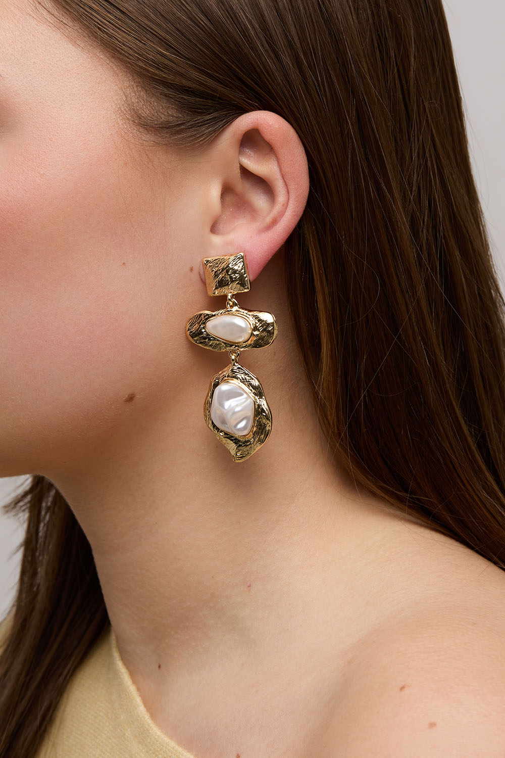 Gullfargede øredobber med anheng og hvite perler i organiske former. Et par dekorative øredobber med et bohemsk design.