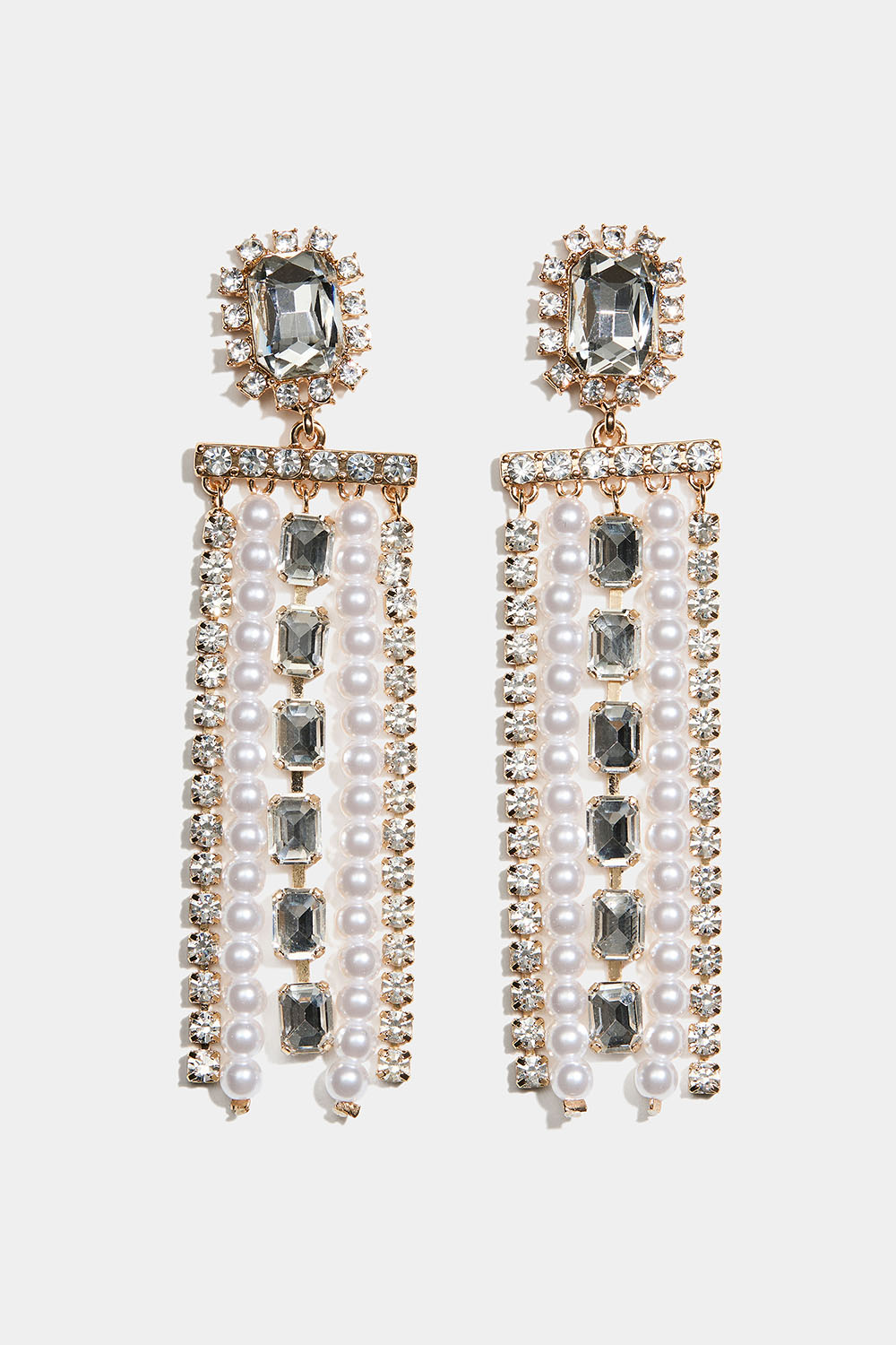 Gullfargede øredobber med rektangulær glasstein og hengende strass- og perlekjeder i gruppen Smykker / Øredobber / Rhinestone hos Glitter (253010362002)