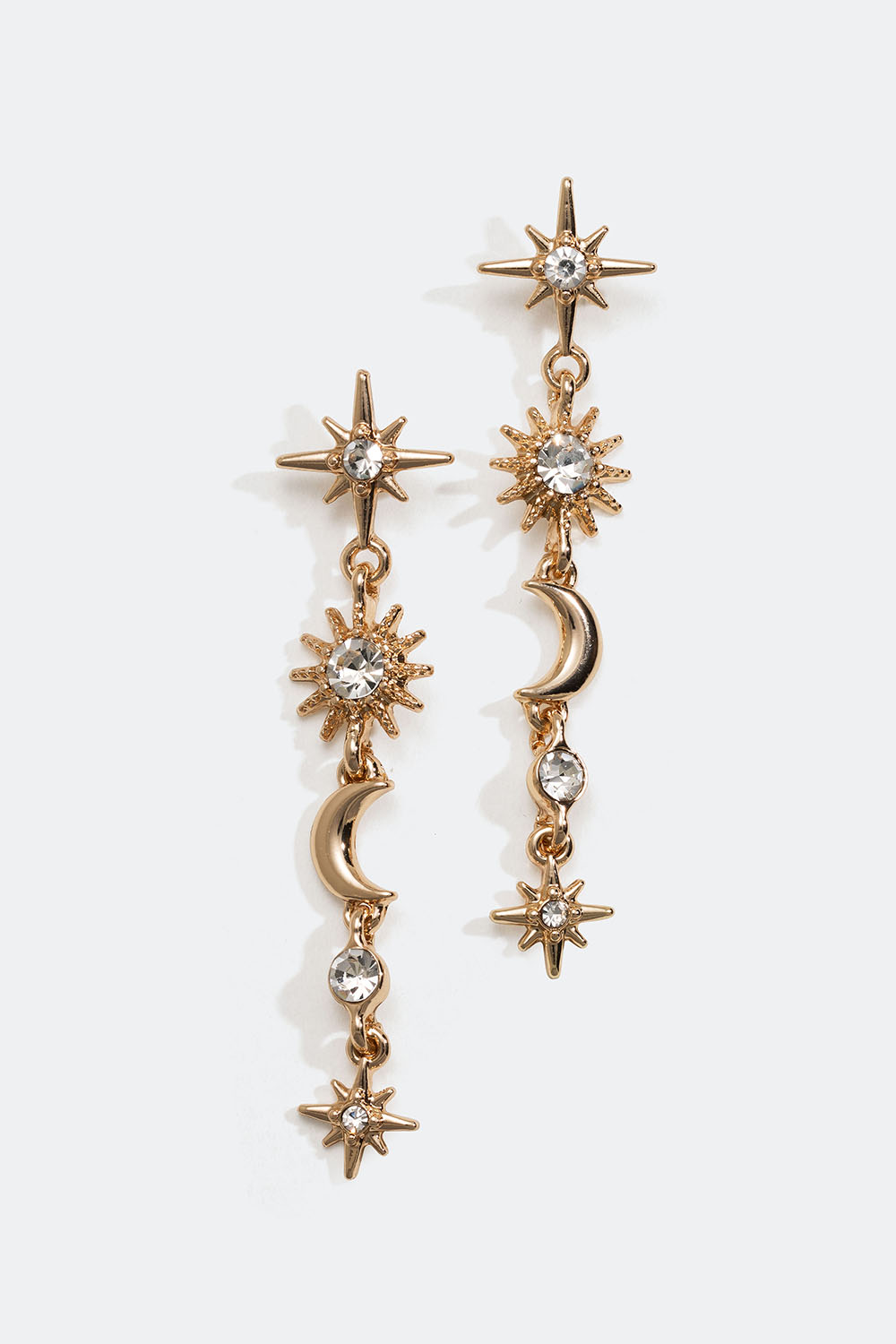 Lange øredobber i gullfarget metall med anheng med stjerner, måner og runde glassteiner.