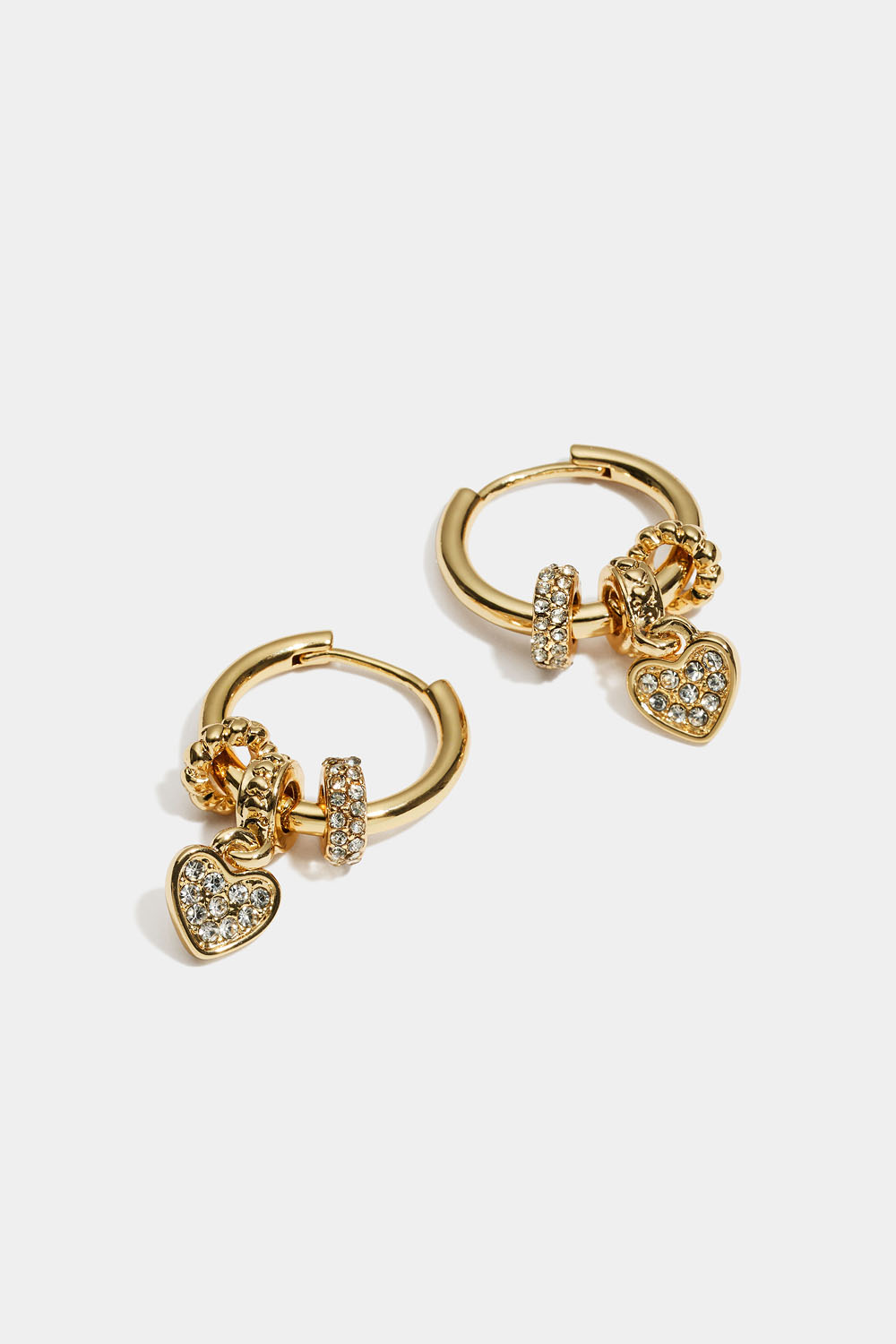 Klassiske øreringer i gullfarget metall med tre runde anheng, det ene med et hengende hjerte.