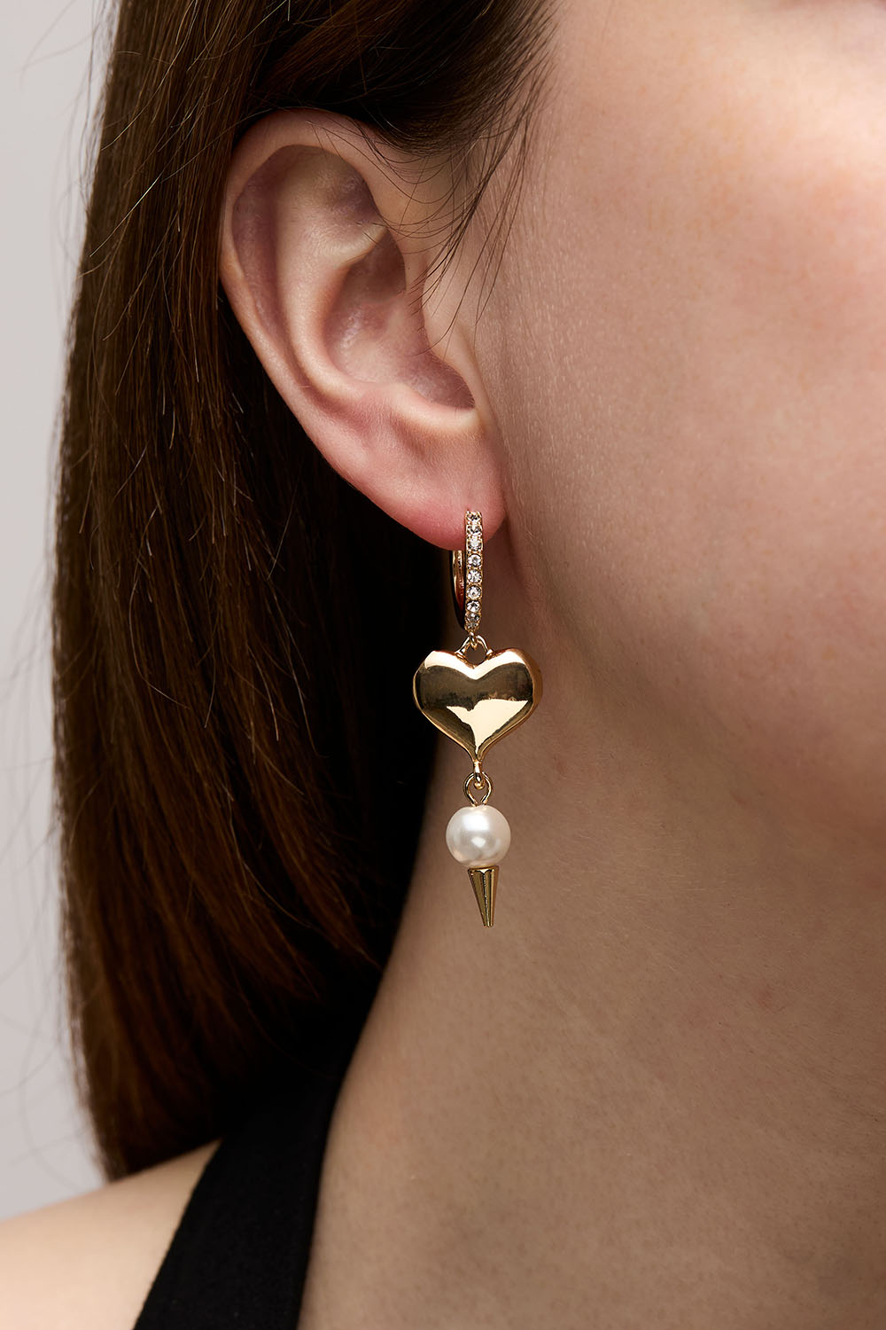 Gullfargede øreringer med hjerte, perle og nagle