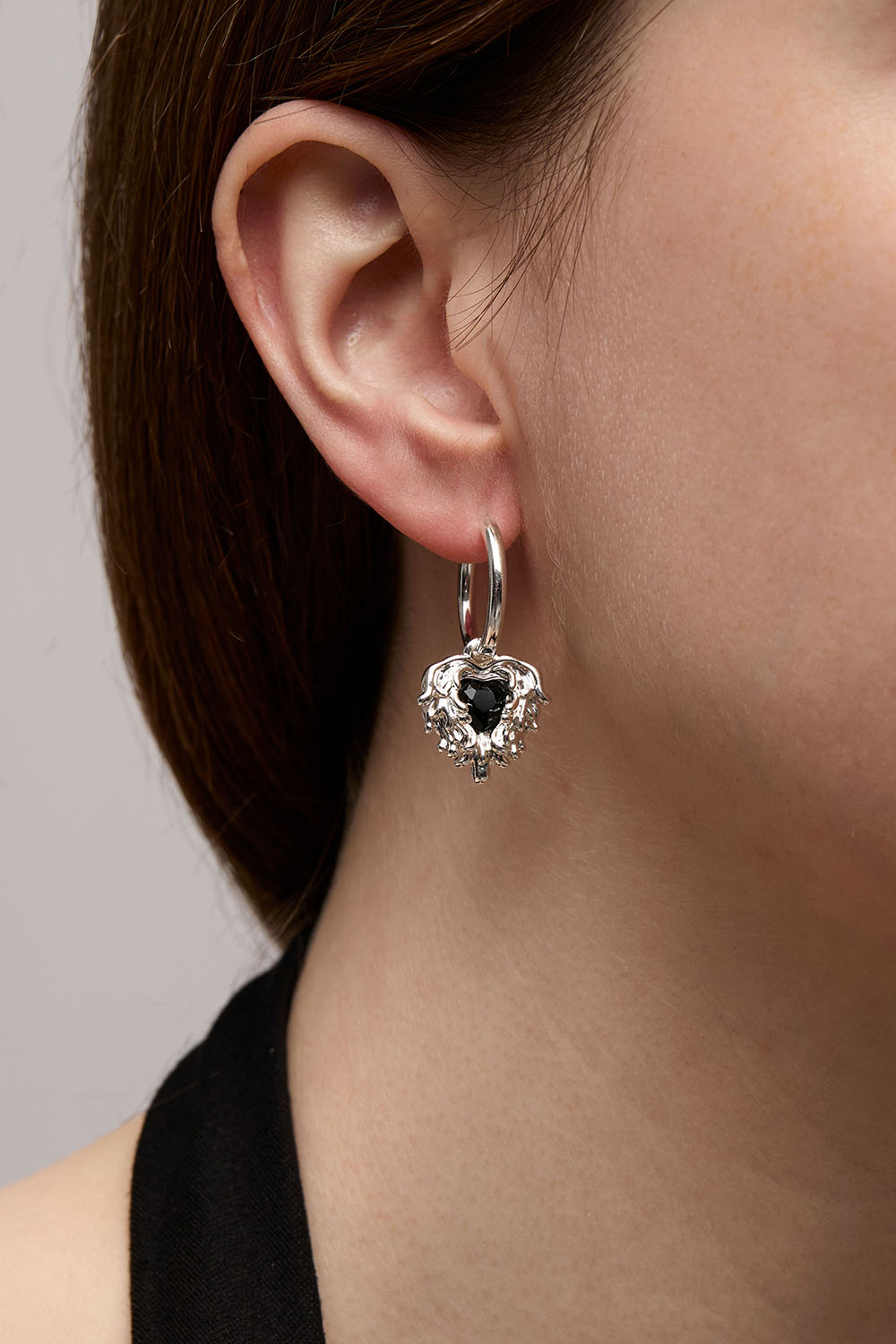 Øreringer med hengende hjerter i smeltet design og svart glasstein.