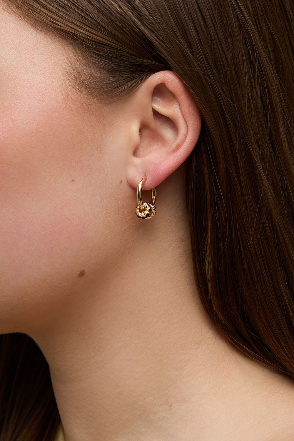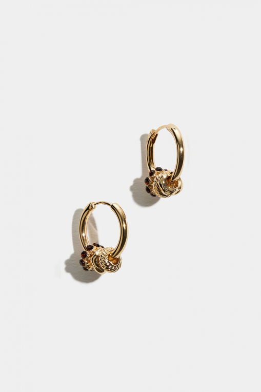 Øreringer i gullfarget metall med runde små anheng i forskjellige design. Anhengene leveres med brune glass-steiner, hamret og vridd design.