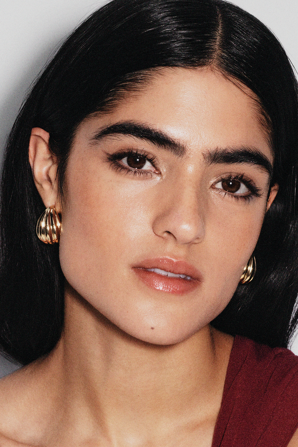 Dråpeformede øredobber med riflet design i gullfarget metall.