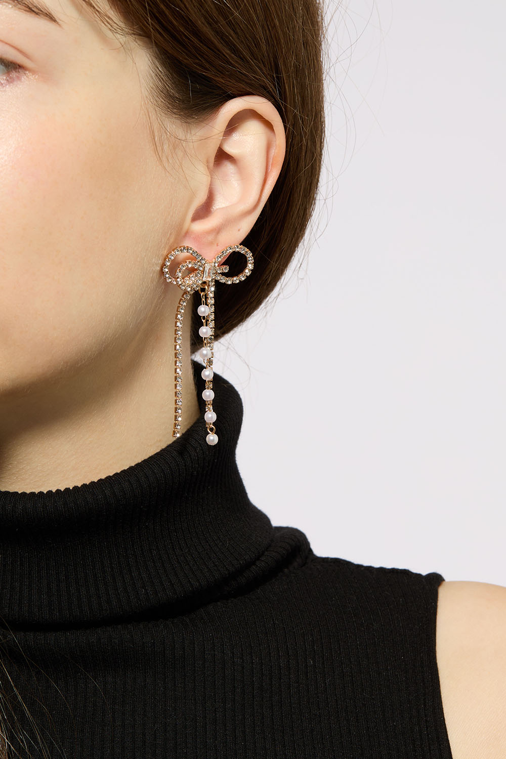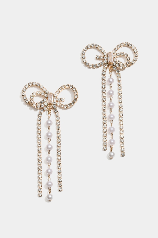 Gullfargede øredobber i sløyfeform med strass og små hvite perler.