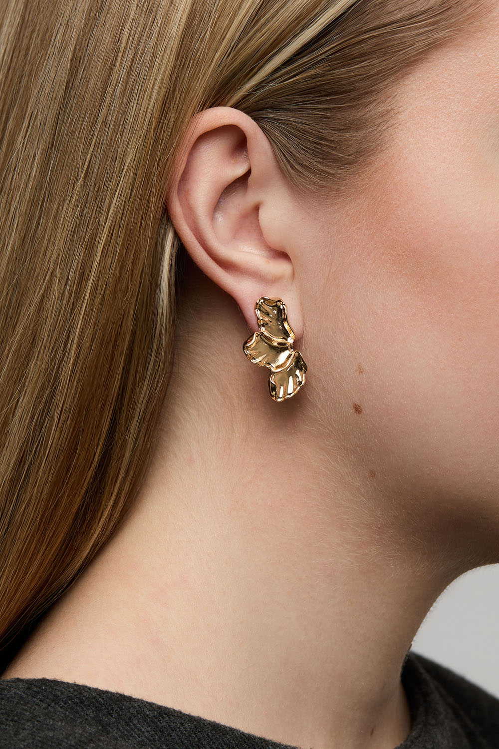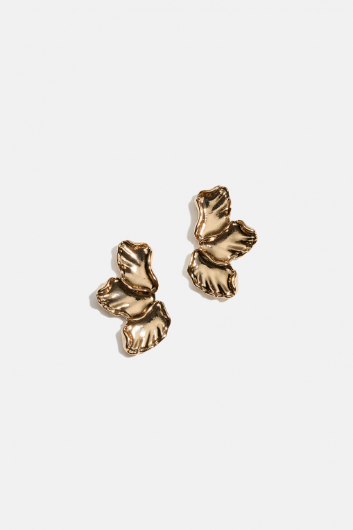Små øredobber i gullfarget metall formet som blomsterblader med opprullede kanter.
