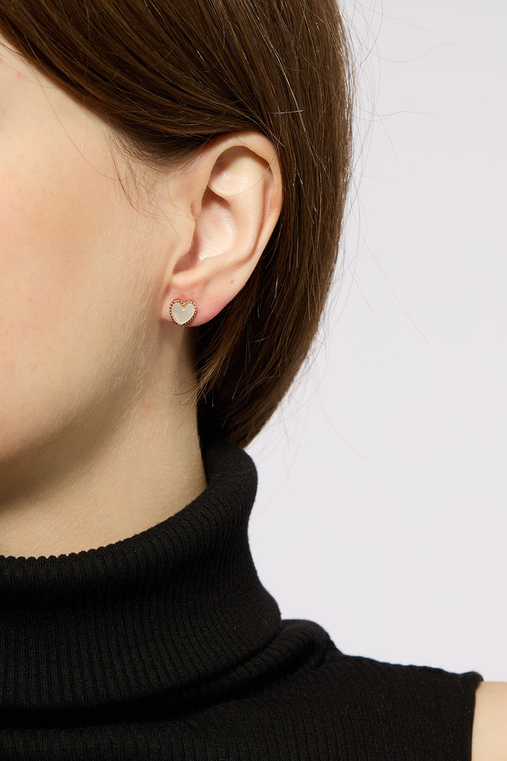 Stiftøredobber med skimrende, hvite hjerter med en tynn kant i gullfarget metall.
