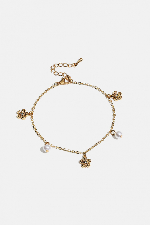 Kjedearmbånd i gullfarget metall med små anheng med hvite perler og blomster i skinnende glassten.