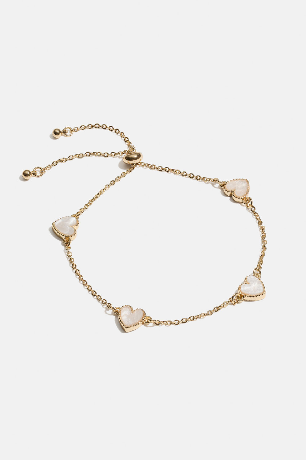 Armbånd med tynt kjede dekorert med hvite, skimrende hjerter. Lengden er justerbar ved hjelp av en gummiert gullperle.
