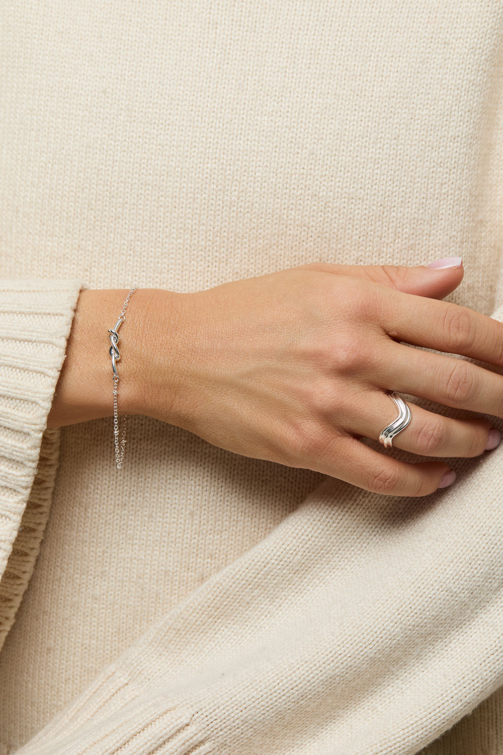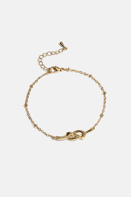 Stilrent armbånd i gullfarget metall med kjede og dekorativ knutedetalj.