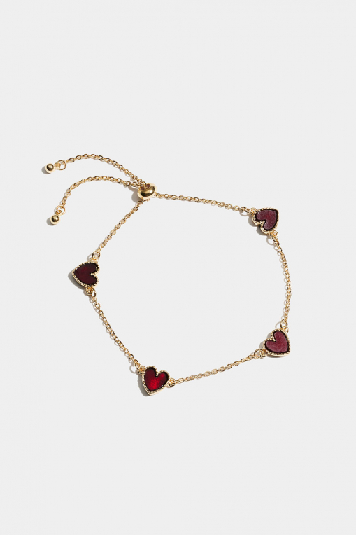 Armbånd med tynt kjede pyntet med røde, skimrende hjerter. Lengden er justerbar ved hjelp av en gummiert gullperle.
