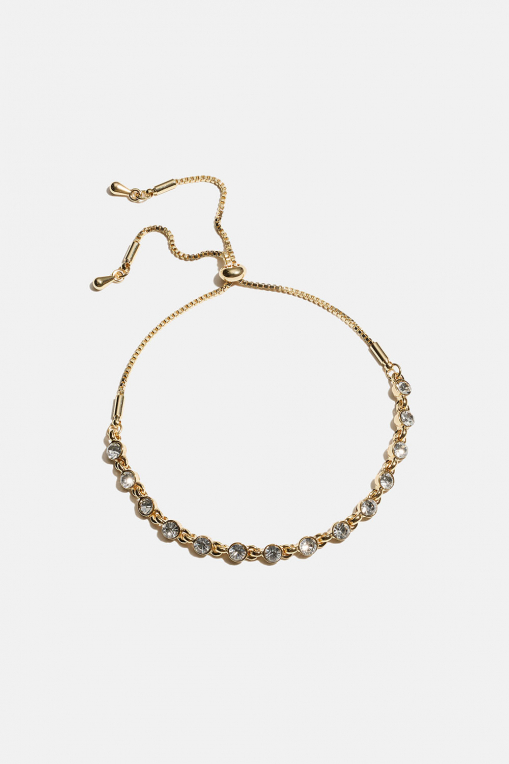 Armbånd i gullfarget metall med en tynn kjede dekorert med små, runde glassteiner. Lengden kan justeres med en gummiert gullperle.