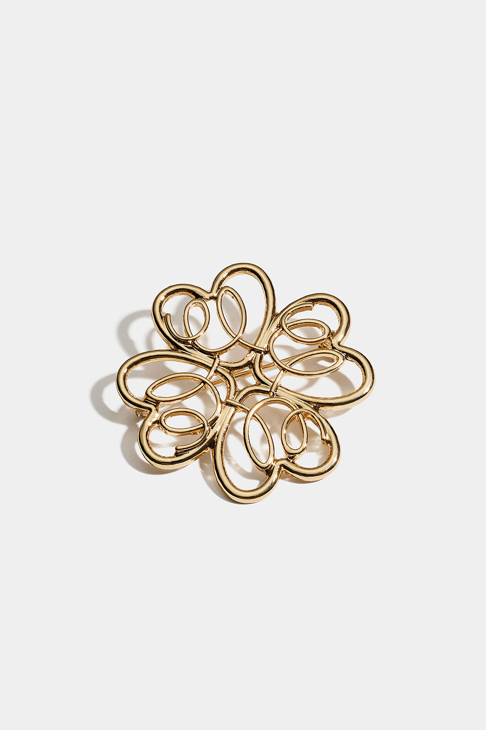 Gullfarget metallbrosje med et luftig mønster av myke slyngende løkker.