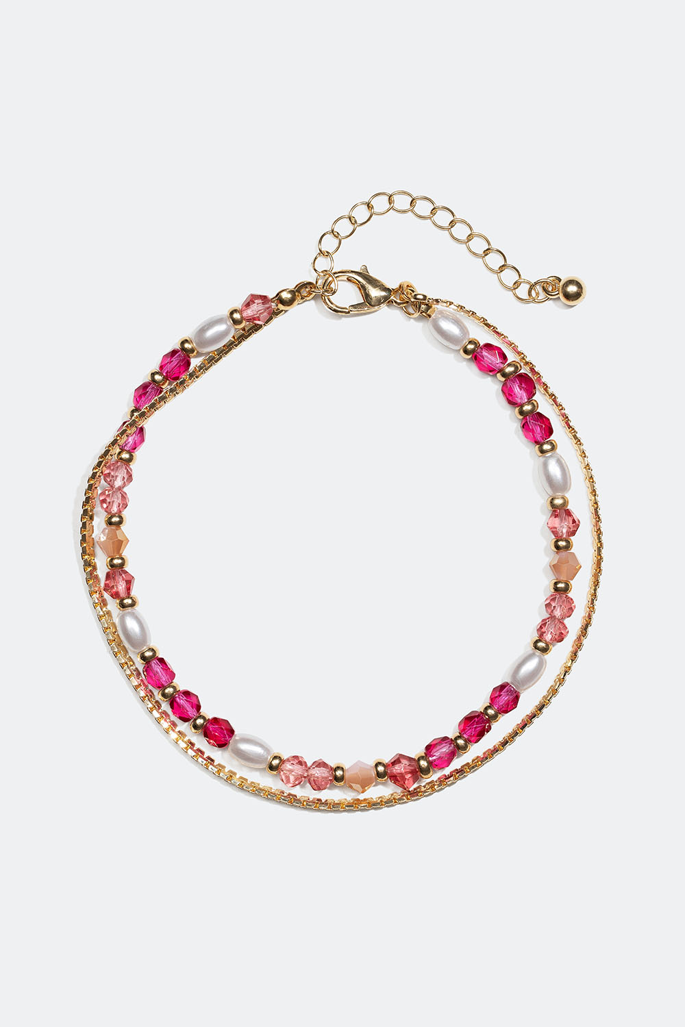 Dobbel fotlenke med perler og kjede Den ene ankellenken har et flatt kjede, mens den andre er dekorert med små perler i forskjellige lyserosa farger. En perfekt kombinasjon av fotlenker til sommeren som setter farge på sommerlooken din.