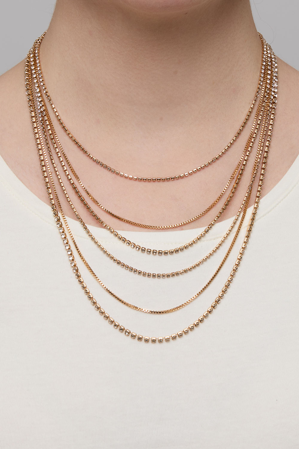 Gullfarget metallhalsbånd i flere lag med en blanding av venetianske kjeder og lenker med glassteiner i ulike lengder. Perfekt for festlige anledninger. Kjedene er koblet sammen og kan ikke brukes separat.