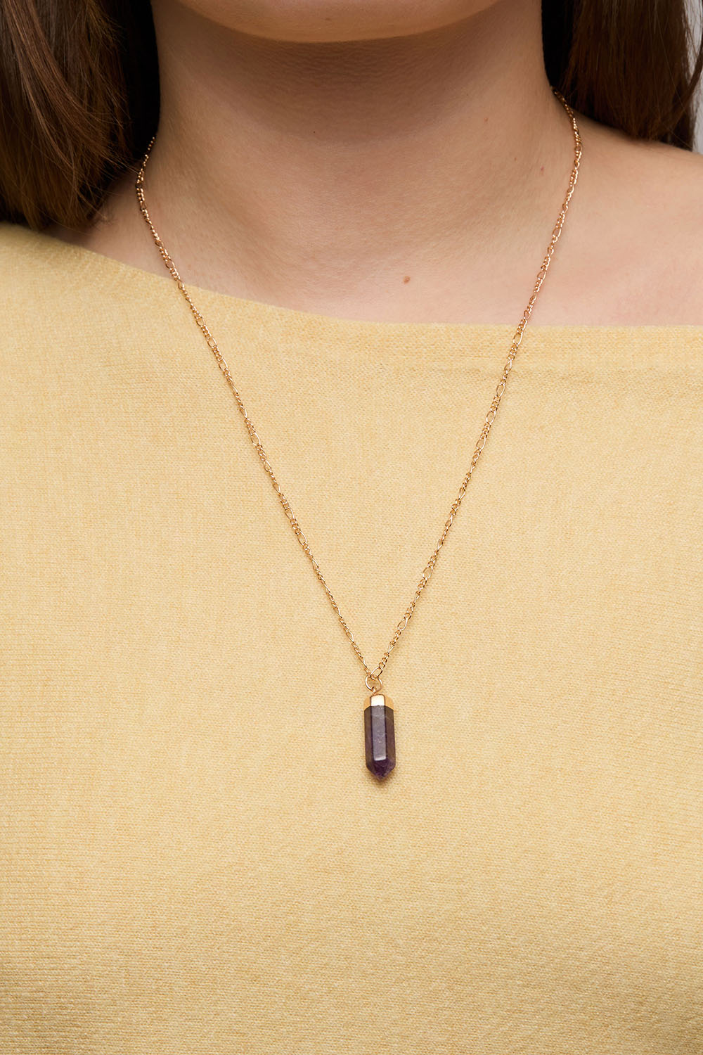 Halskjede i gullfarget metall med figarokjede og ametystanheng.