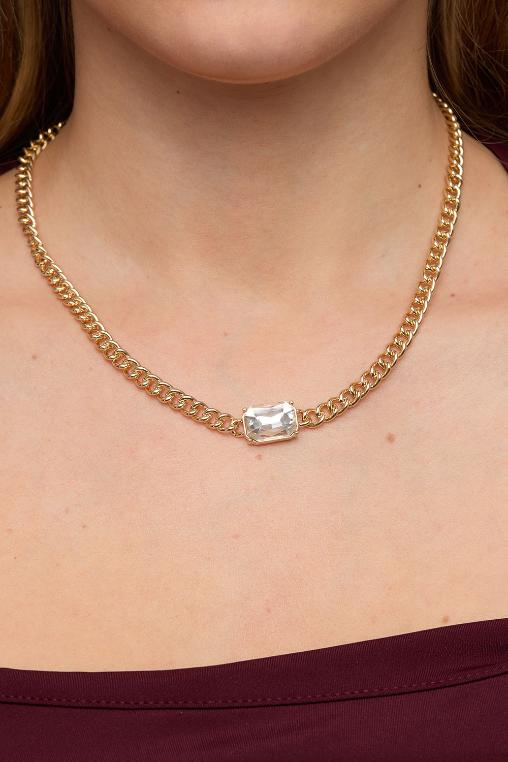 Halskjede i gullfarget metall med grov kjede og en stor rektangulær glasstein.