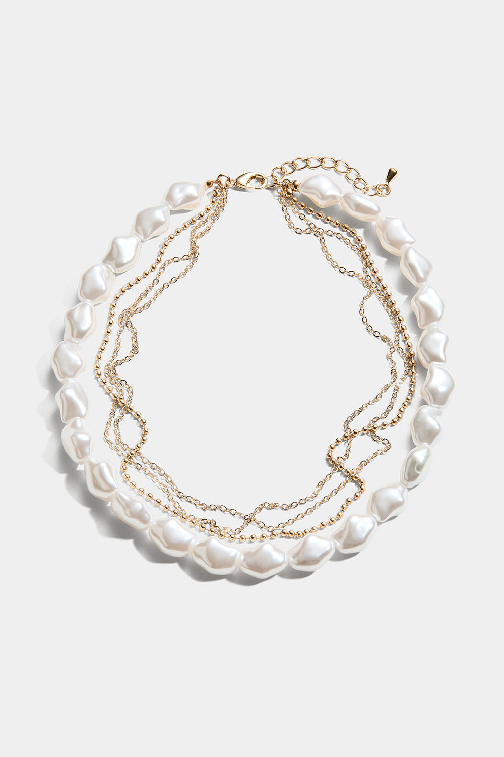 Halskjede med tre kjeder i gullfarget metall og ett med store, hvite perler i organisk form.