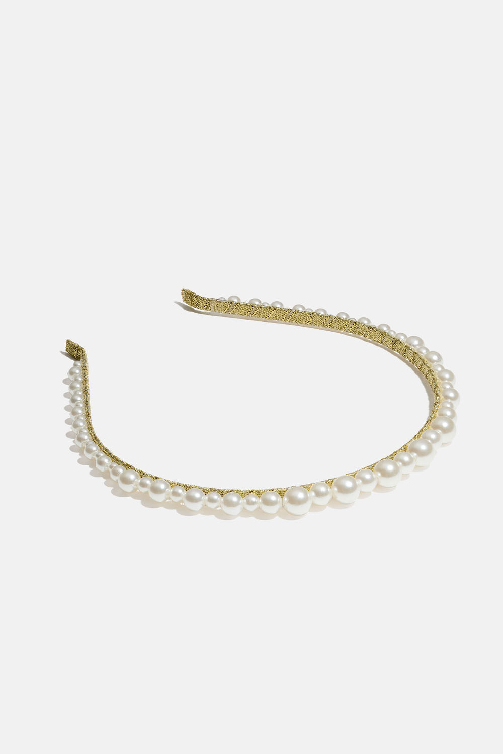 Smal hårbøyle med gullfarget bånd pyntet med hvite perler i forskjellig størrelse.
