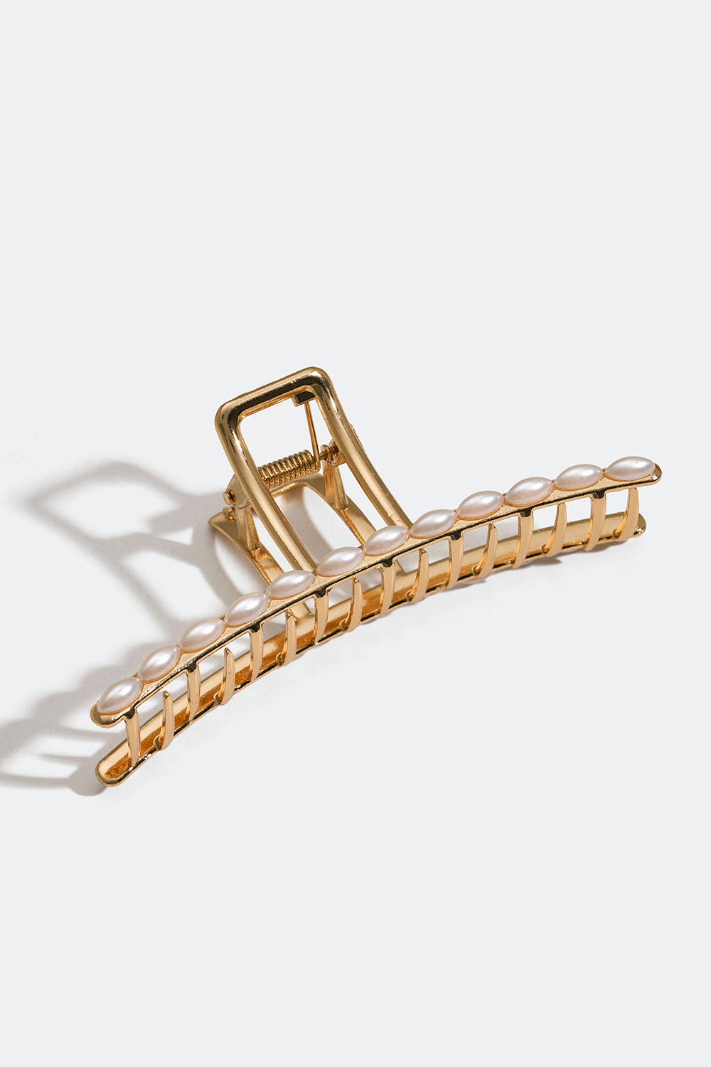 Avlang, smal hårspenne i gullfarget metall dekorert med hvite perler.
