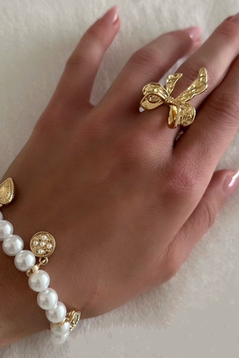 Ring i gullfarget metall med sløyf i hamret tekstur.