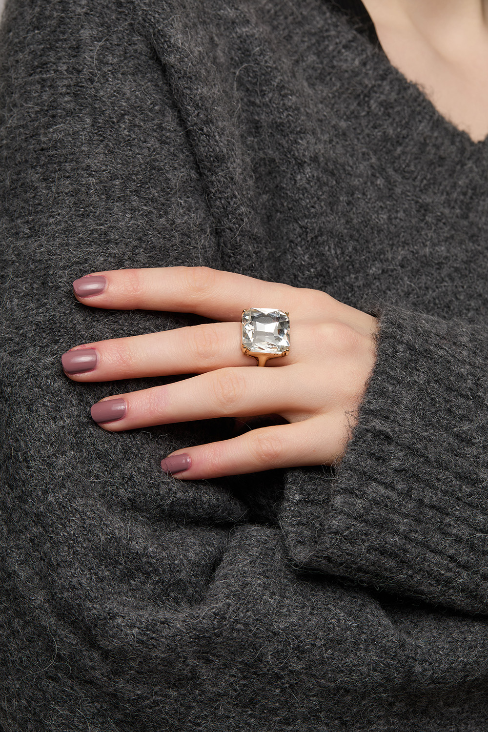 Ring i gullfarget metall med stor hvit firkantet glassstein.