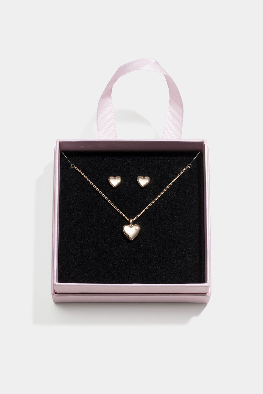 Smykkesettet består av et par gullfargede øredobber med hjerter og et gullfarget kjede med hjerteanheng, pent pakket inn i en rosa gaveeske med sort velurpute.