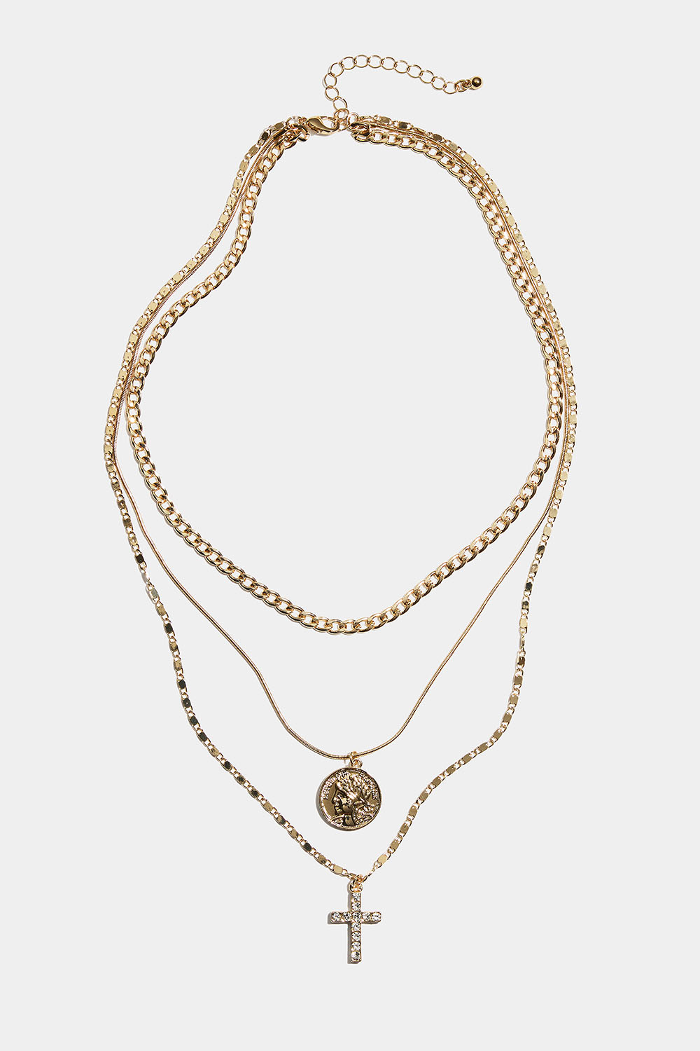 Halskjede med tre kjeder i forskjellige design med to anheng formet som mynter og et kors dekorert med strass.
