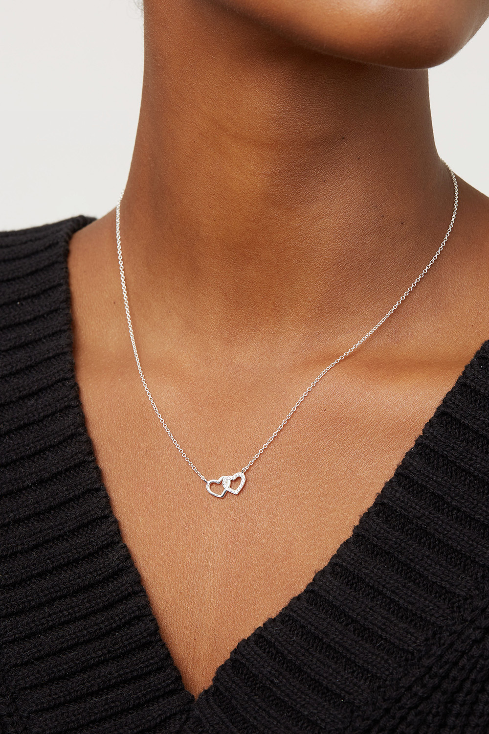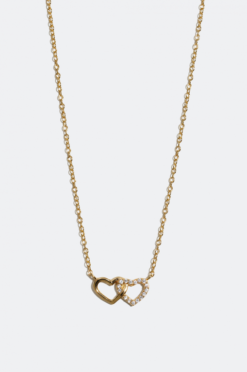 Halskjede i ekte sølv forgylt med 18 karat gull, med to sammenlenkede hjerter, hvorav det ene er pyntet med små zirkoniastener. Et stilrent smykke som passer til alle anledninger. Kjedet er 42 cm langt, men kan forlenges til 45 cm hvis du vil ha et lengre halskjede.