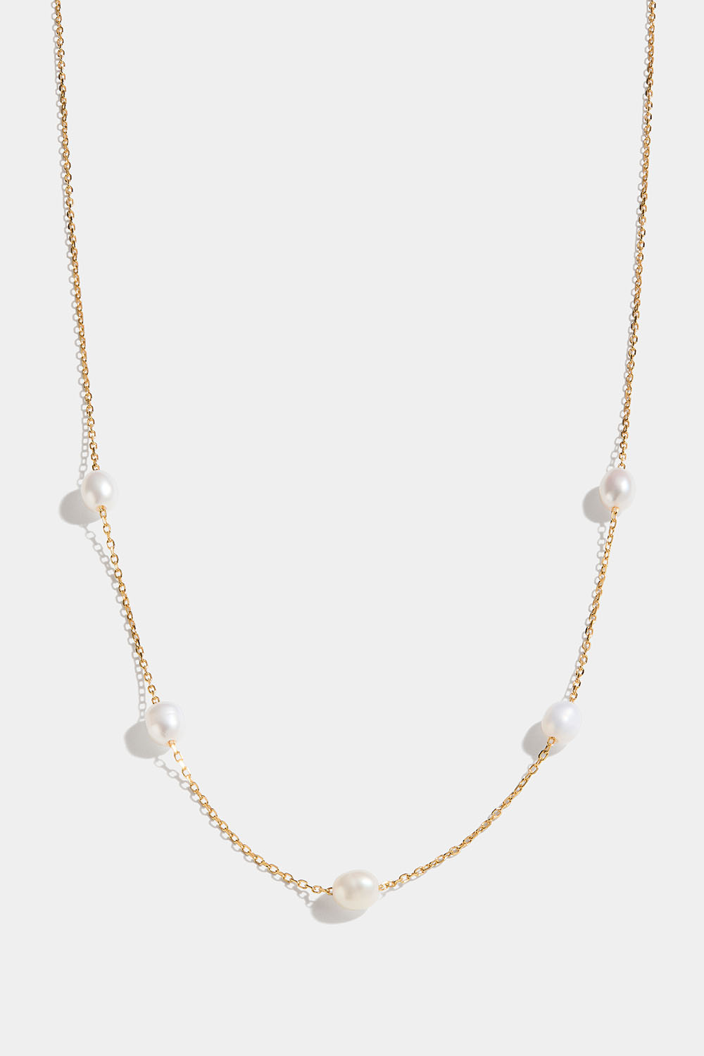 Tynt halskjede i 18 k forgylt ekte sølv med fem ovale ferskvannsperler.