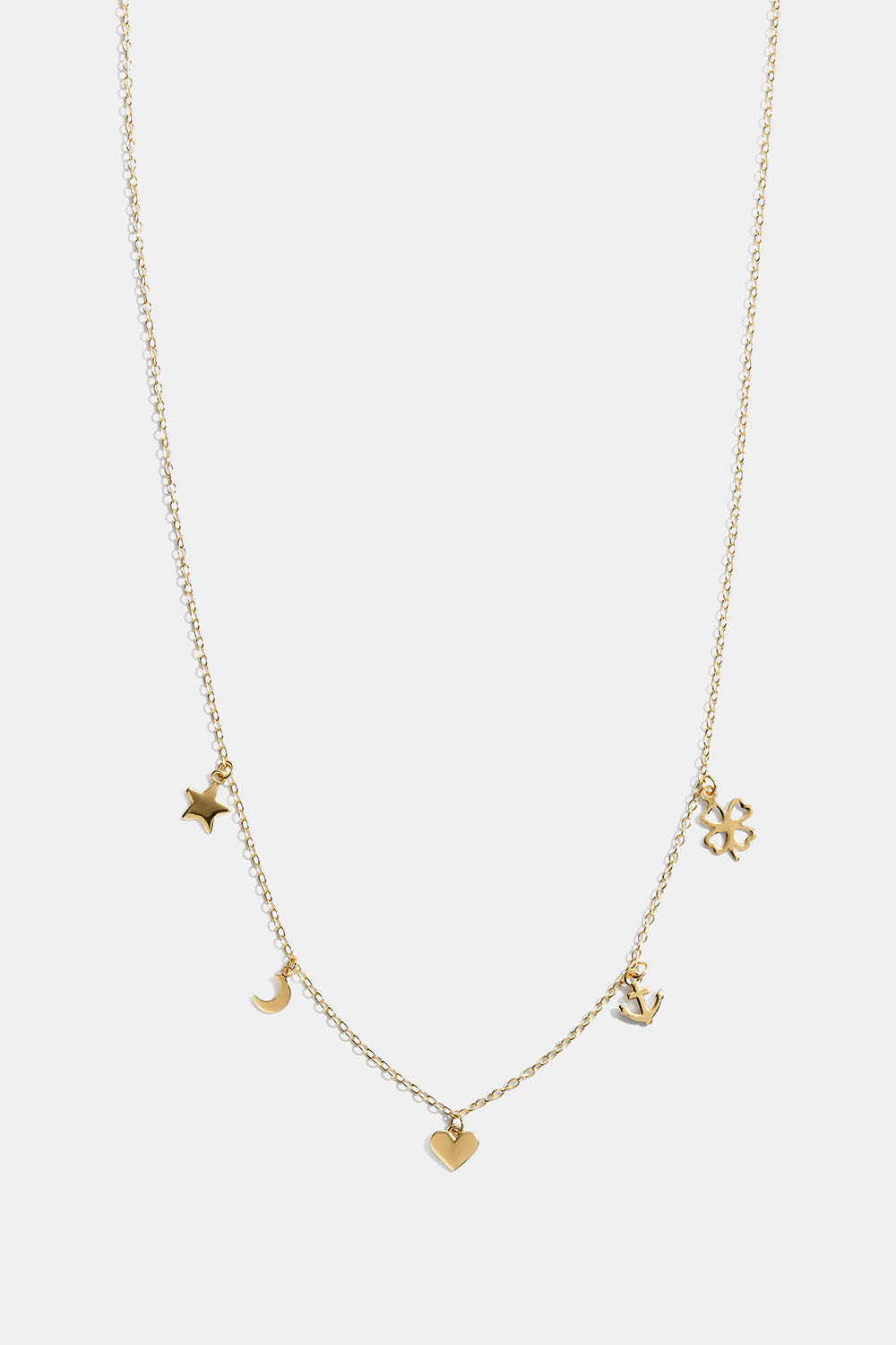 Halskjede i 18k forgylt ekte sølv med små, hengende charms, en stjerne, en måne, et hjerte, et anker og en firkløver.
