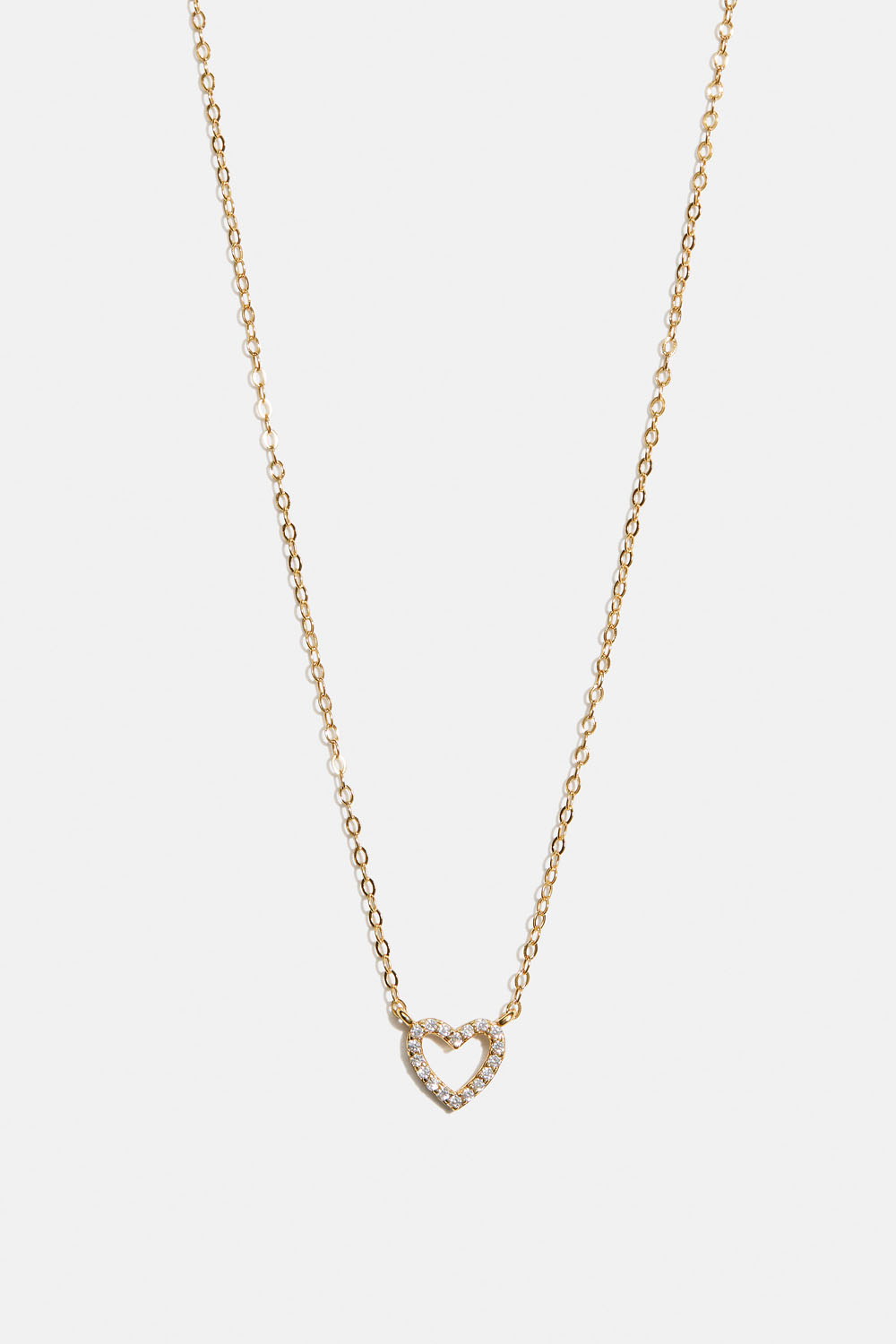 Halskjede i 18k forgylt ekte sølv med tynt kjede og et hjerte dekorert med små, hvite Cubic Zirconia-steiner.