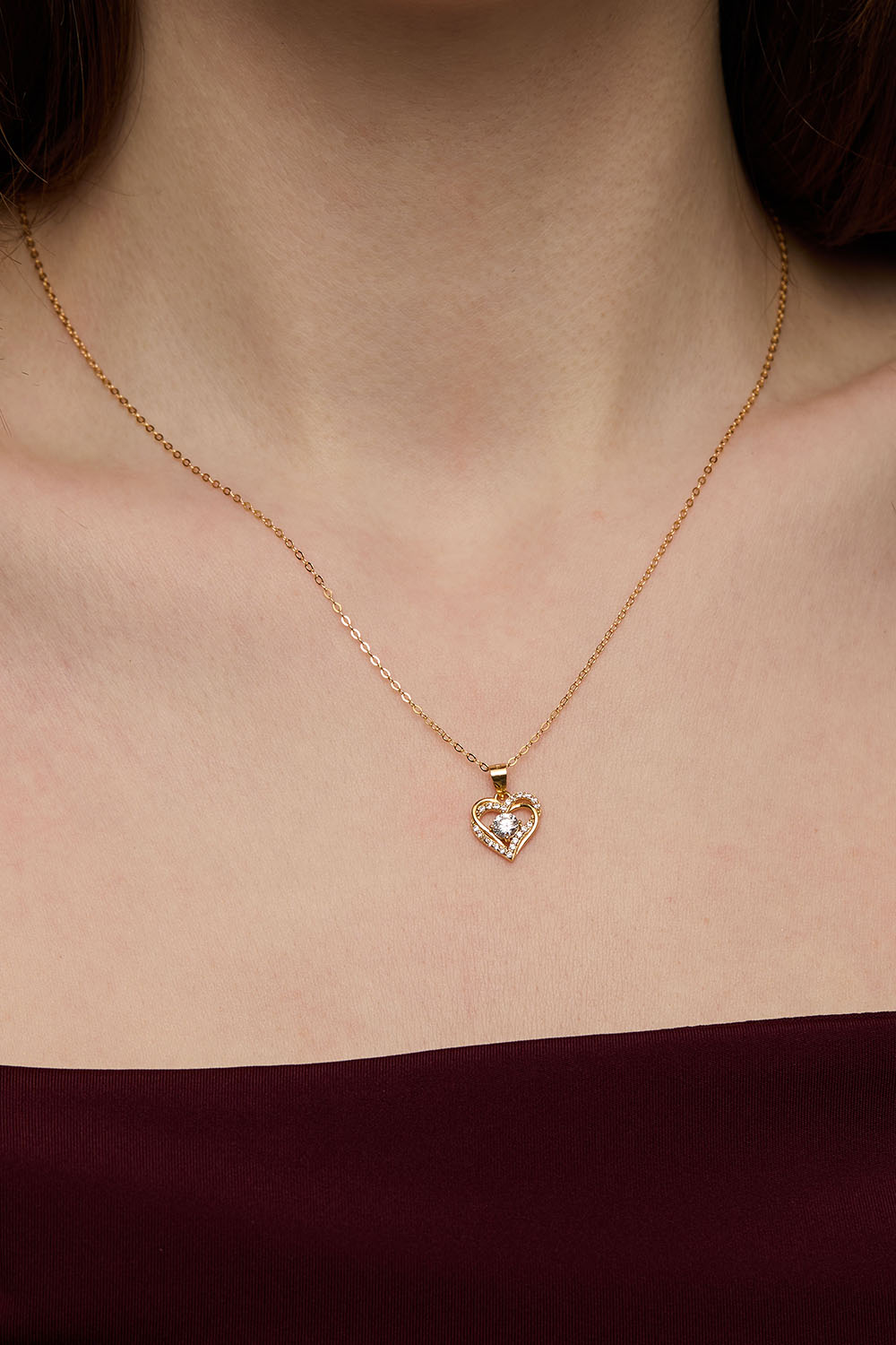 Halskjede i 18k gullbelagt ekte sølv med sammenstilte hjerter, ett av dem dekorert med kubisk zirkonia-steiner. I midten av hjertene er det en større stein.