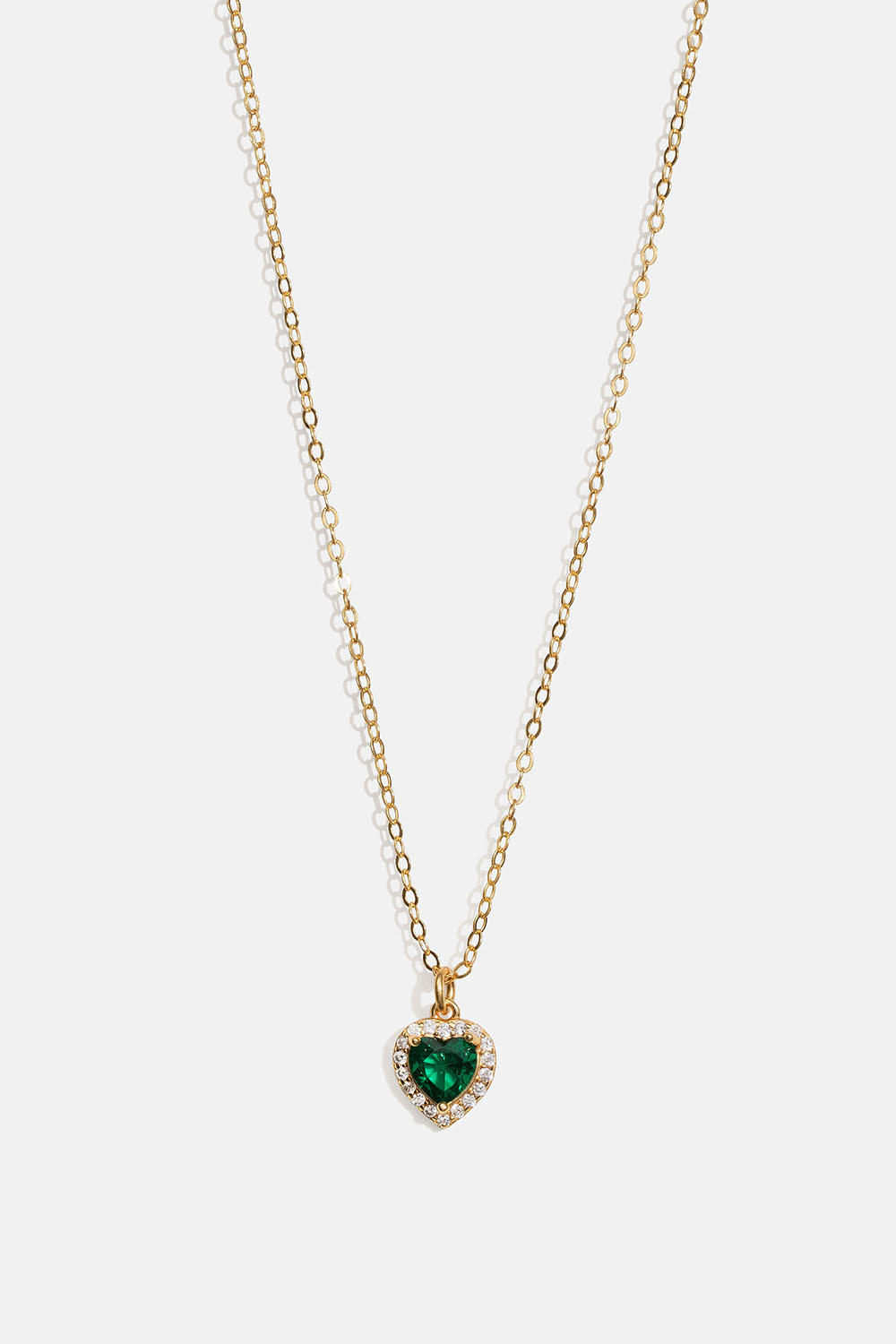 Halskjede i ekte sølv med 18 karat gullplett og et hjerteformet anheng. Anhenget har en grønn, hjerteformet zirkoniasten med mindre, hvite zirkoniastener rundt.