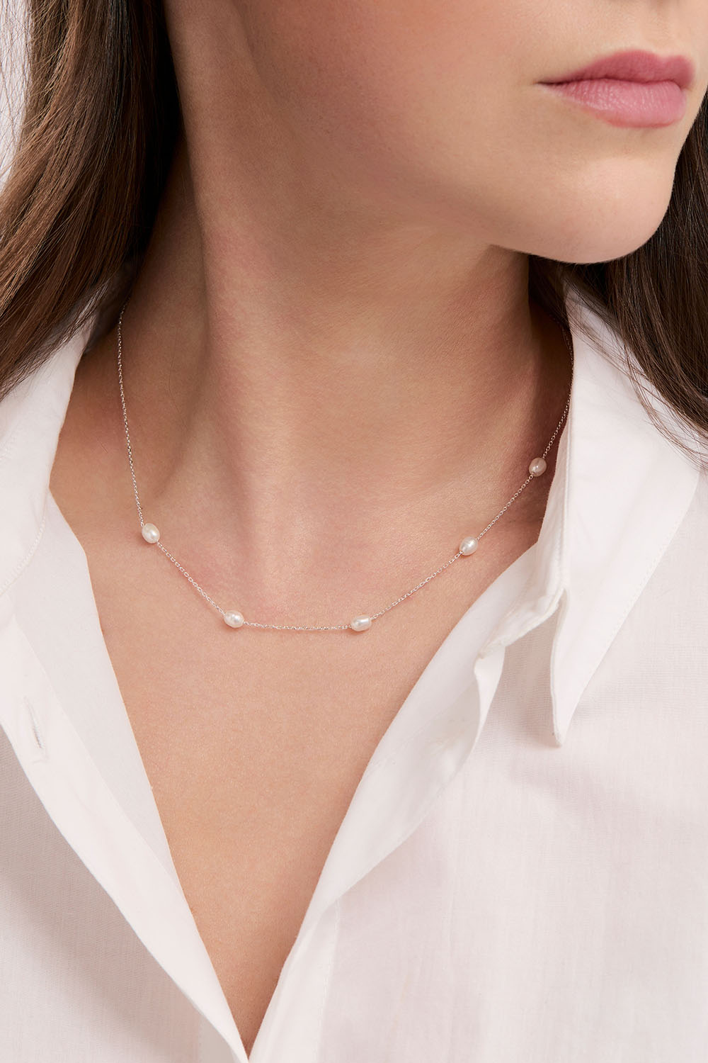 Halskjede i ekte sølv med tynt kjede og fem ovale perler.