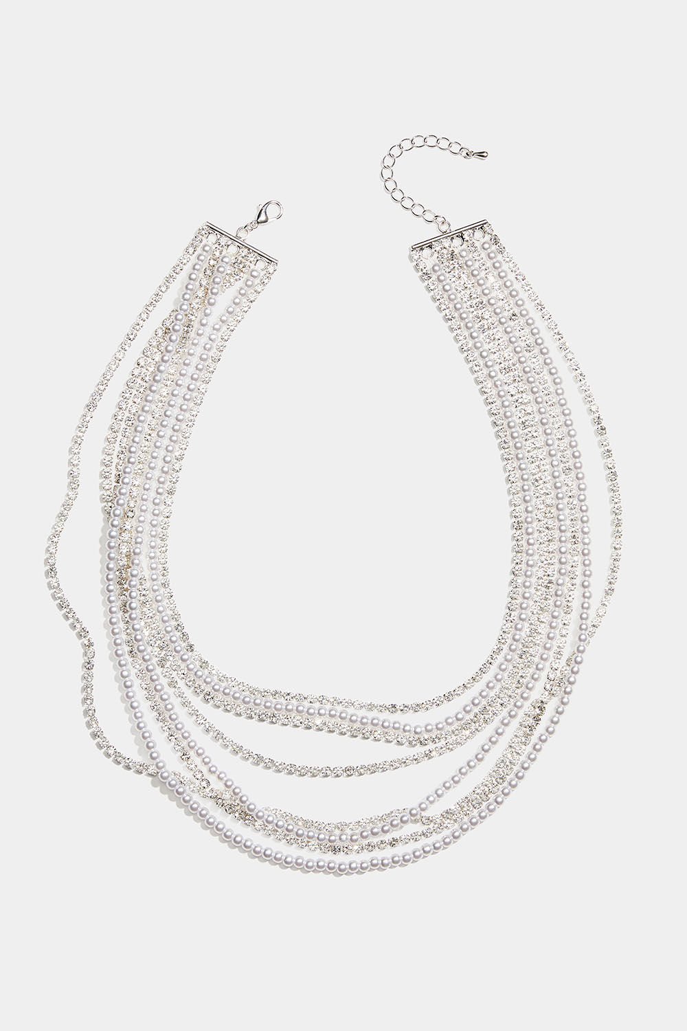 Halskjede med åtte lenker i ulik lengde, fem med strass og tre med hvite perler.