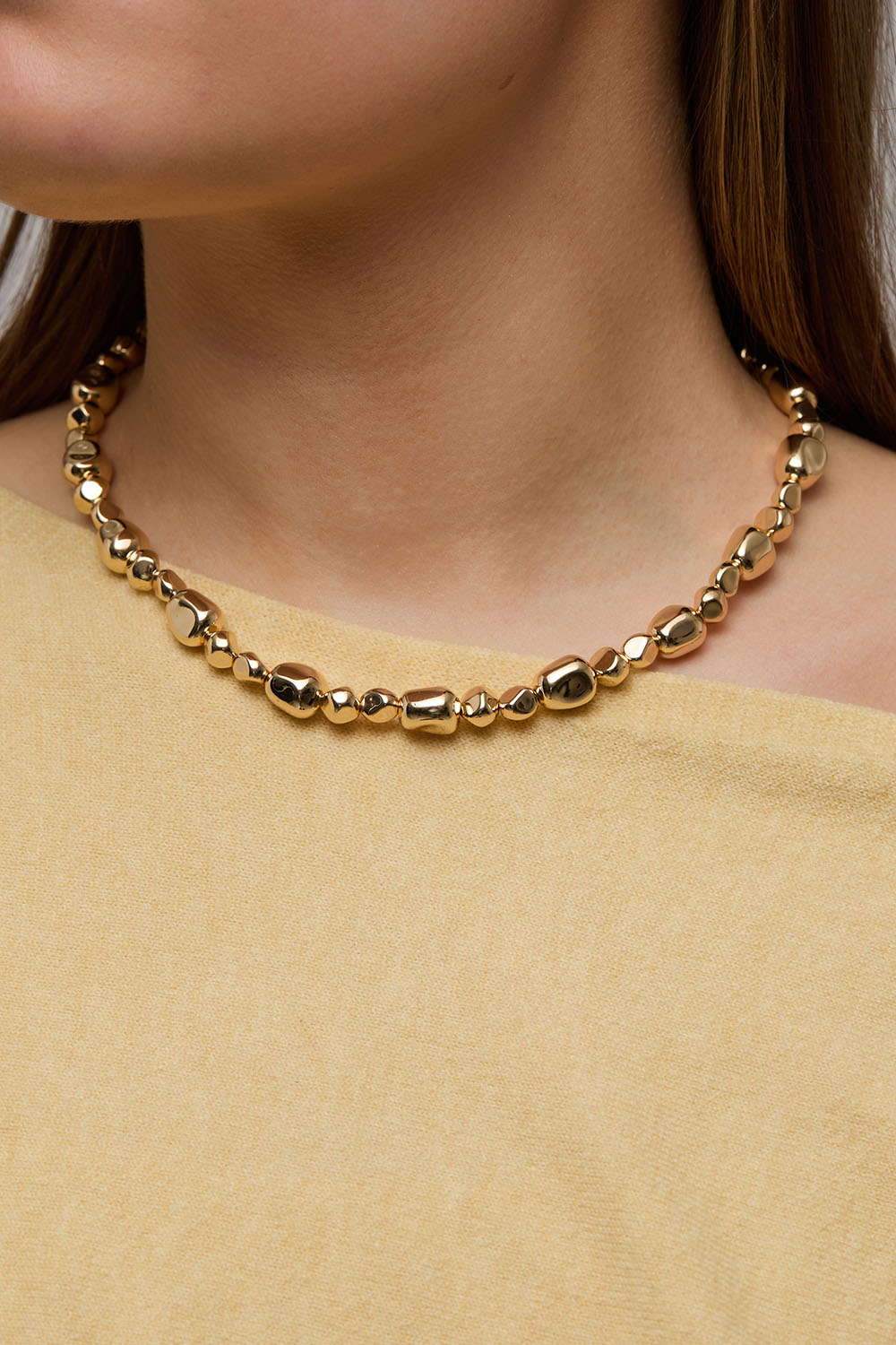 Halskjede med gullfargede perler i ulik størrelse i organisk design.