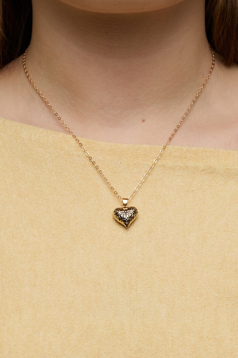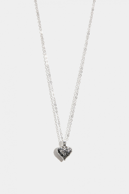 Halskjede i metall med et mønstret hjerte i antikk stil.