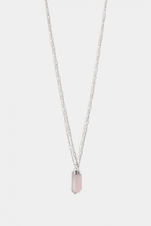 Halskjede i metall med figarokjede og rosenkvartsanheng.