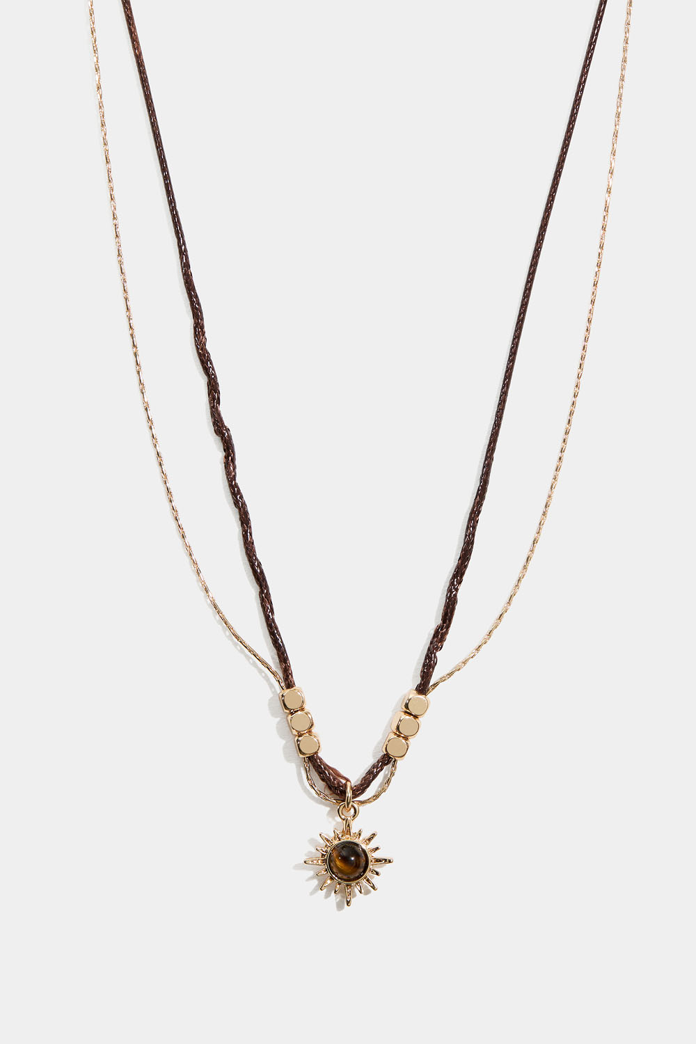Halskjede med tynt kjede i gullfarget metall og brun snor, dekorert med gullperler og et solanheng med tigerøye.